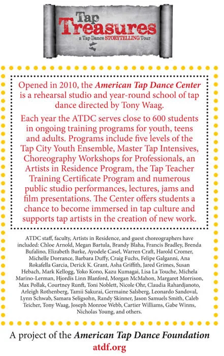 "Tap Treasures reinvestigates and revisits eight historic locations in Manhattan that contributed to the evolution of tap dance. As we celebrate an almost forgotten history of this fascinating art form, let us not forget the people, the places and events that have influenced, perpetuated and molded our very own American art-form Tap Dance, born and raised right here in New York City.” Tony Waag, Artistic Director & Producer